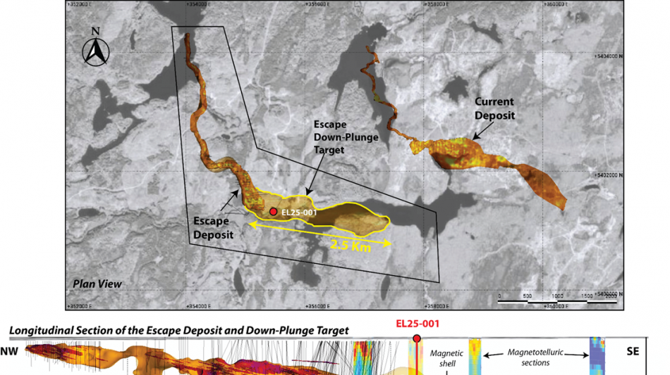 During the summer of 2025, the Company completed its first hole (EL25-001) within the projected down-plunge extension of the Escape Deposit. The modelled extension is largely based on 3D magnetic inversion data, which show that the Escape Deposit and the extension target are part of a single, sinuous to linear magnetic anomaly sourced from altered ultramafic rocks that host the Escape Deposit. The extension also features local conductivity anomalies (Figure 1) that are of immediate interest for drilling. Drillhole EL25-001 tested one of these coincident magnetic and conductivity anomalies and, more specifically, a "ballroom"-shaped coincident anomaly analogous to the high-grade ballroom structures recently intersected at the Current Deposit (see April 15, 2025, News Release).